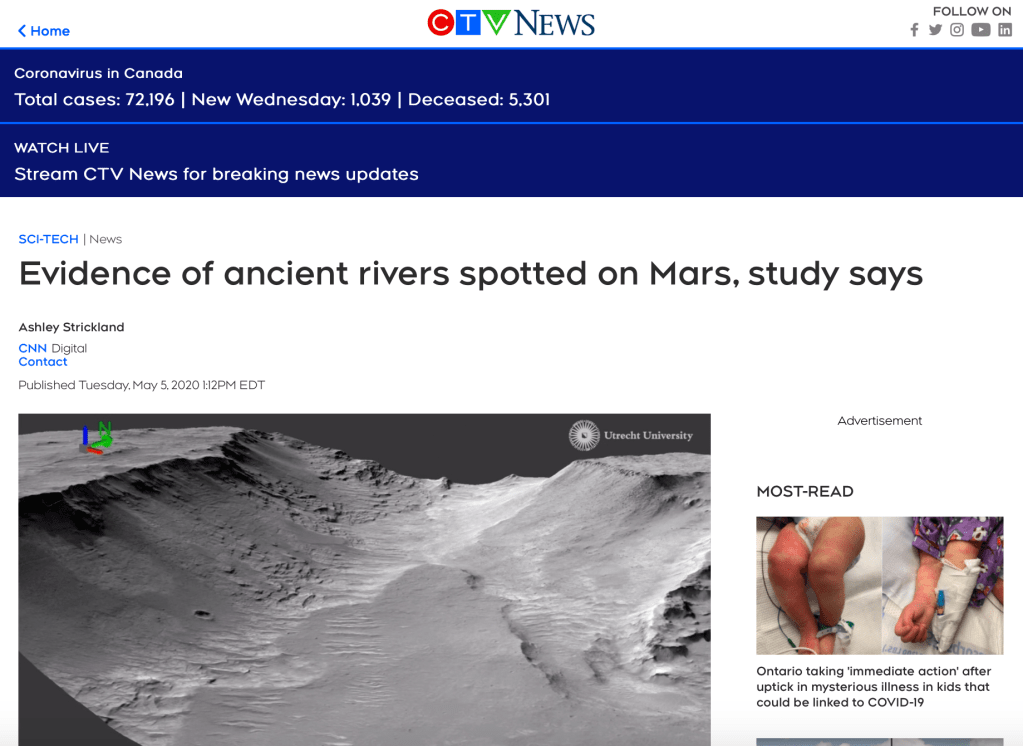 NEWS NATURE COMMUNICATIONS I’M CURRENTLY UPDATING THIS PAGE, CHECK BACK SOON! CNN – https://edition.cnn.com/2020/05/05/world/mars-river-evidence-scn-trnd/index.html Interview with Corriere della Sera – La Lettura on Mars Exploration and my research – July 12th, 2020 BBC – https://www.bbc.co.uk/newsround/52555723 The Times – https://www.thetimes.co.uk/article/long-lost-rivers-give-clue-to-life-on-mars-xxbhjjlv0 The Daily Mail – https://www.dailymail.co.uk/sciencetech/article-8288997/Extinct-extra-terrestrial-equivalent-Rhine-spotted-Mars.html CTV – https://www.ctvnews.ca/sci-tech/evidence-of-ancient-rivers-spotted-on-mars-study-says-1.4925790 Condividi: Click to share on X (Opens in new window) X Click to share on Facebook (Opens in new window) Facebook Like Loading...